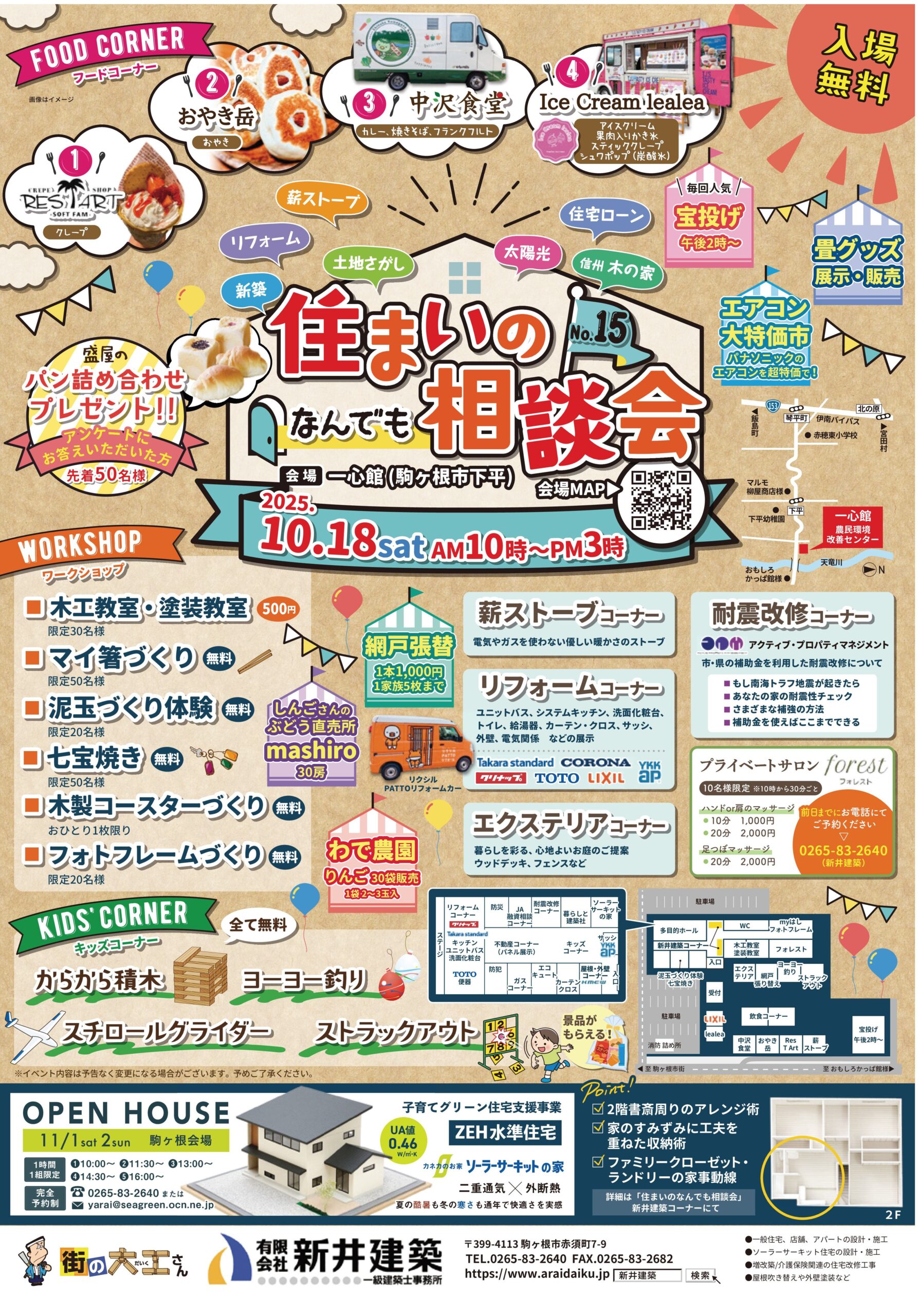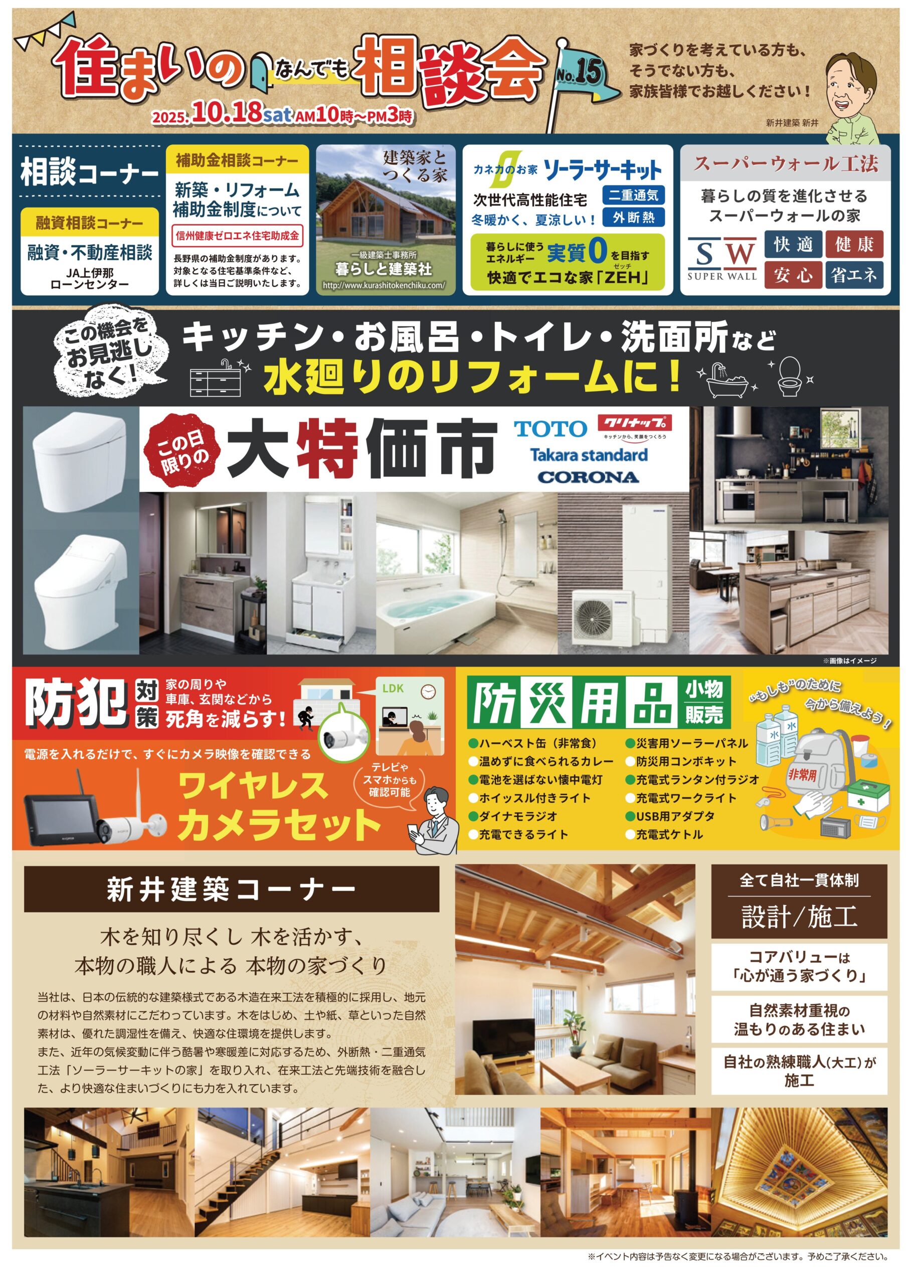 また、10月18日には、駒ケ根市下平の一心館にて、住まいのなんでも相談会を開催します。