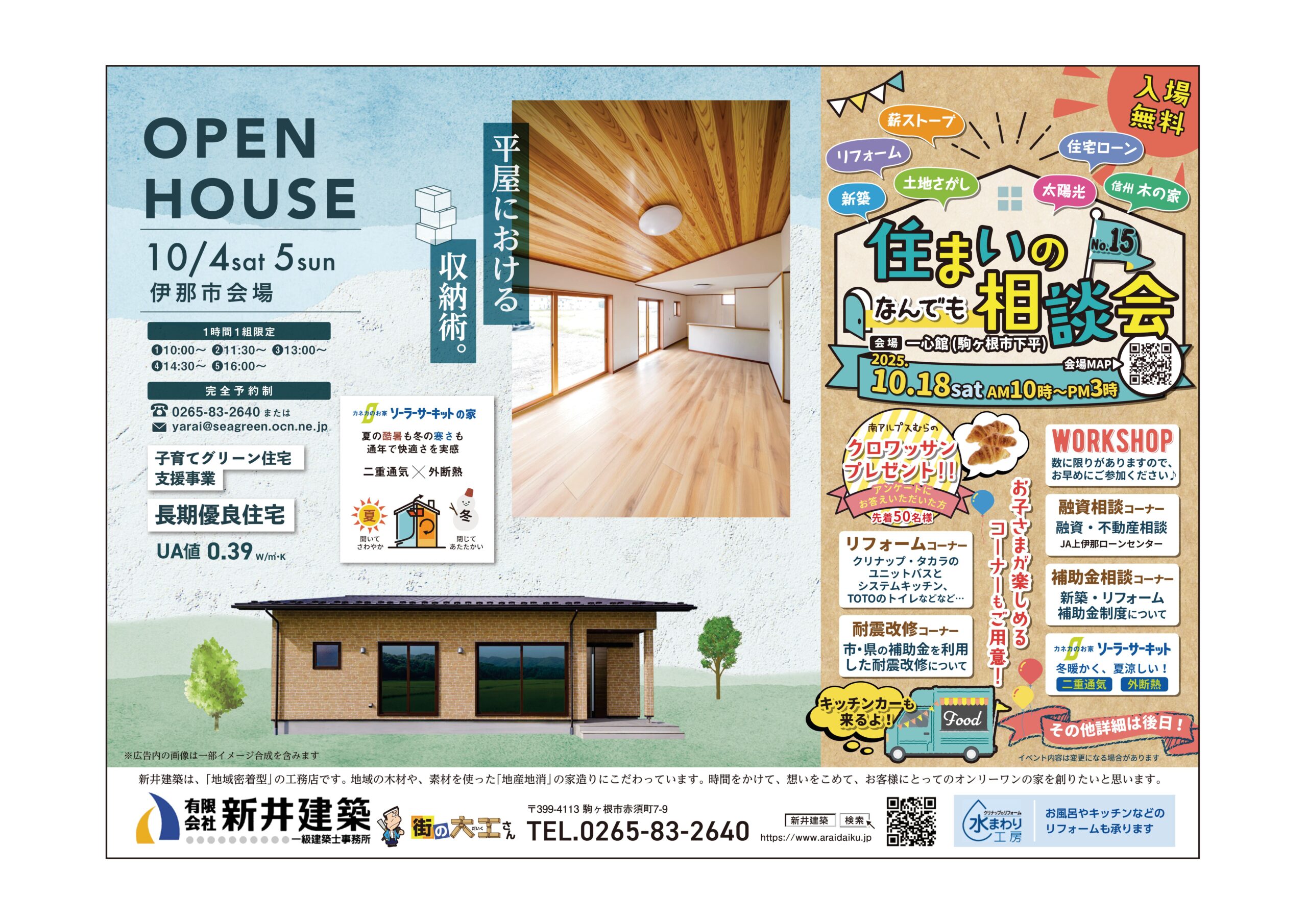 ㈲新井建築(駒ヶ根市)は、10月4日、5日に伊那市で、平屋における収納術OPEN HOUSEを行います。