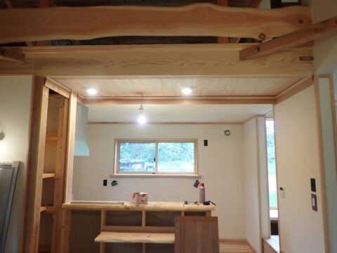 リビングから台所をみる 上はロフト 白壁はチャフウォール
