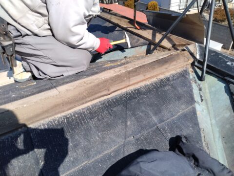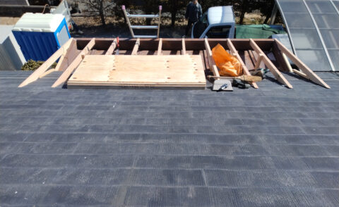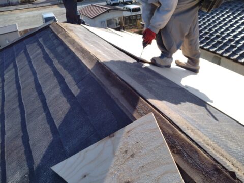 既存屋根の上から新設屋根の下地を施工。